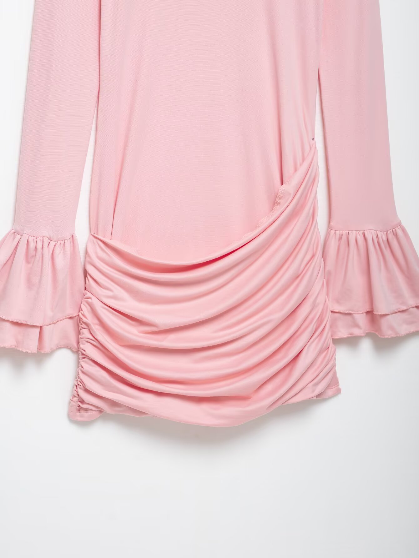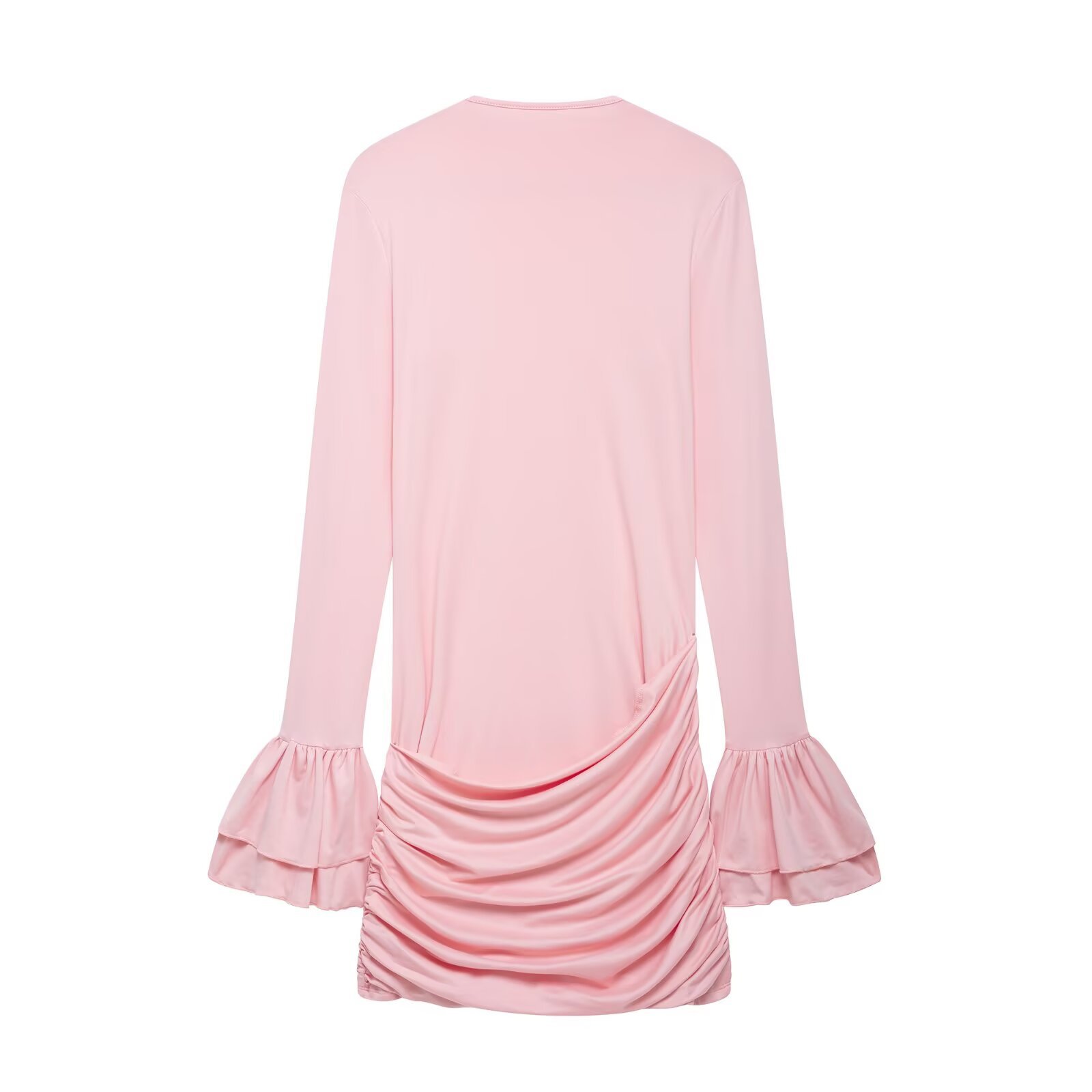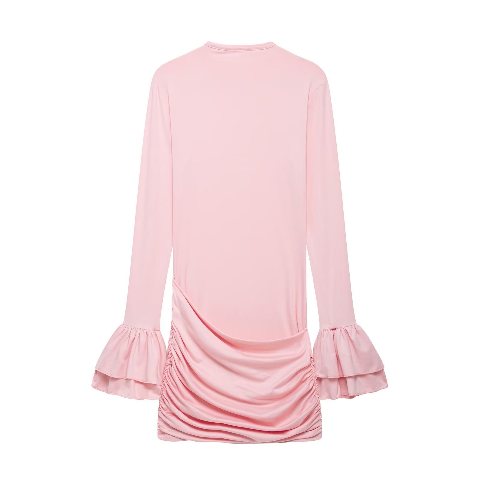 Women Round Neck Flared Sleeves Pleated Short Skirt Dress
