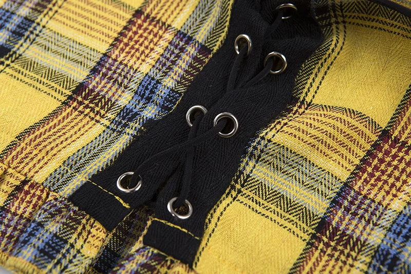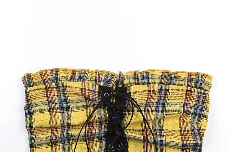 Plaid Ruffle Lace Up Tank Top Boho Yellow Crop Off Shoulder Backless